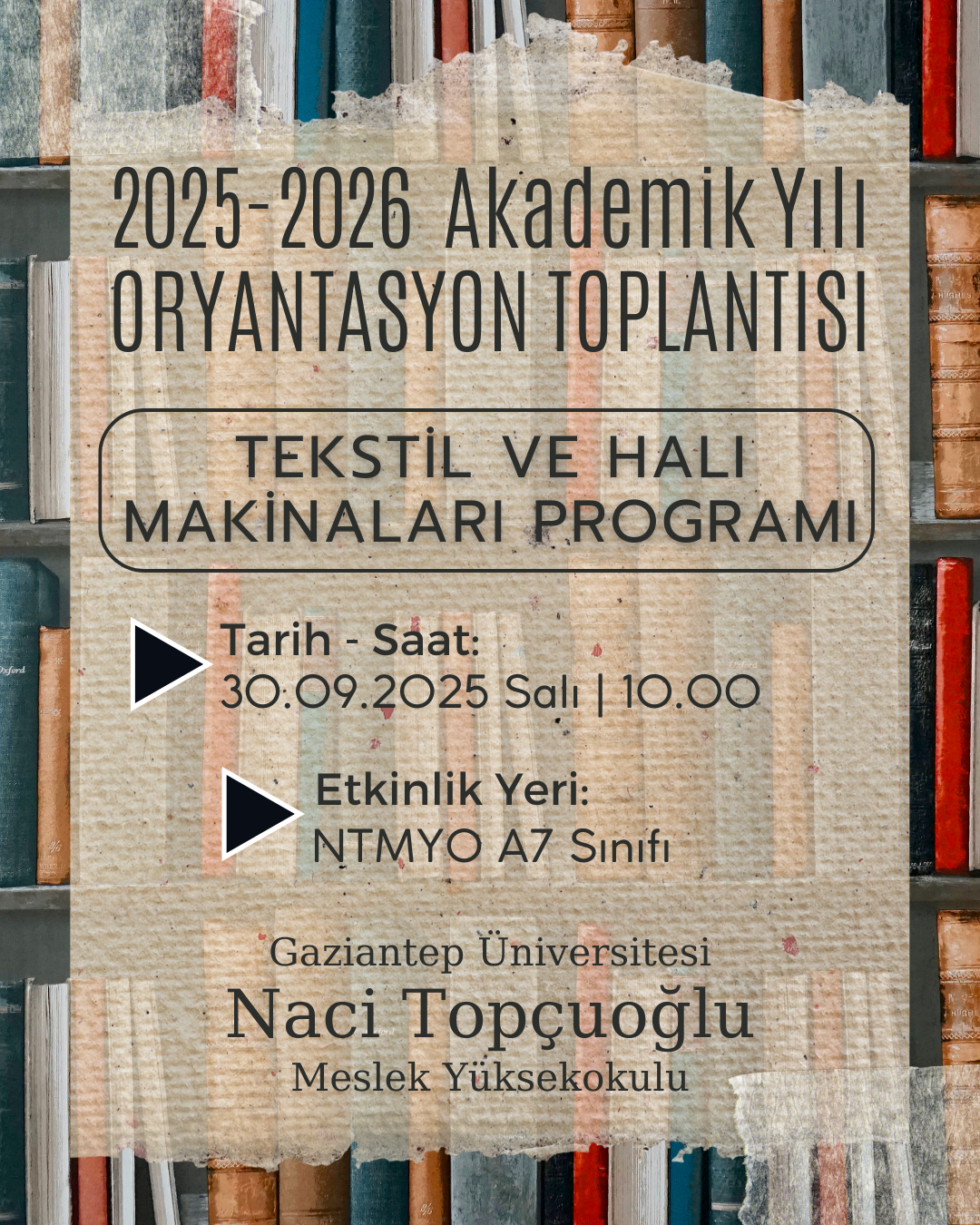 2025-2026 Akademik Yılı başlangıcı kapsamında Tekstil ve Halı Makinaları Programı öğrencilerine yönelik düzenlenecek olan oryantasyon toplantısına tüm öğrencilerimizi bekliyoruz.